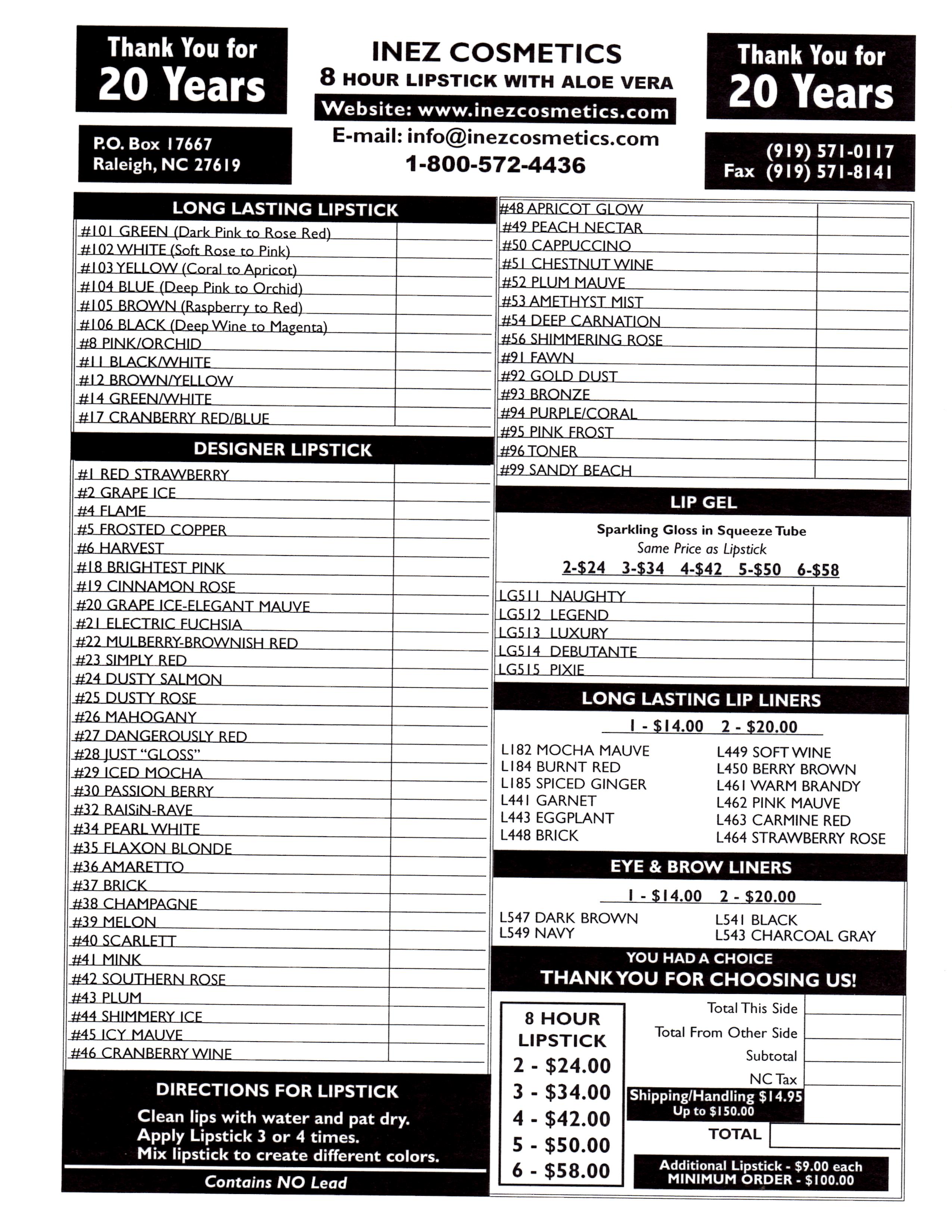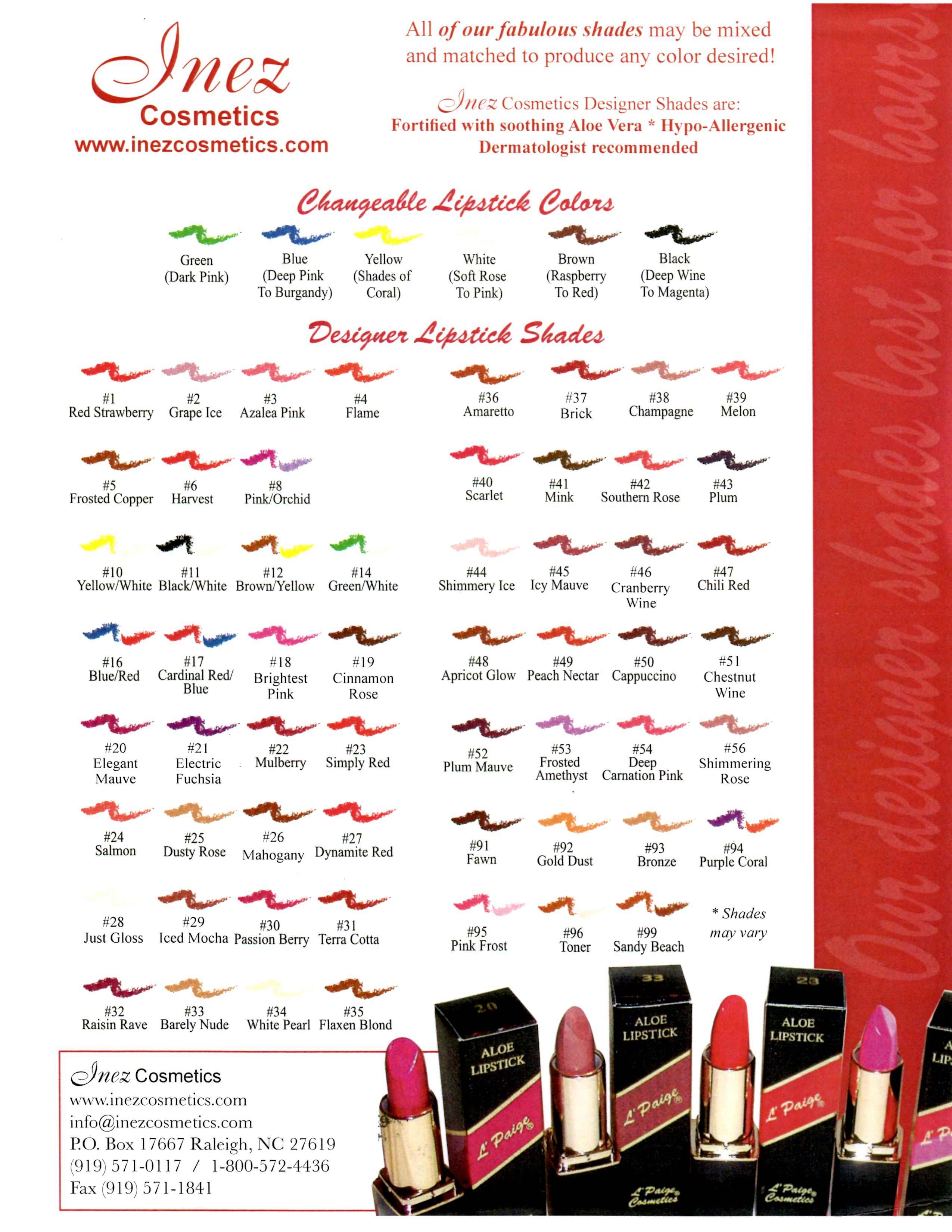Lip/Eye/Brow Liners: Our liners are the traditional pencil type. These liners glide on easily and blend well with smudger tool. Try our Inez Cosmetics liner sharpeners too! These sharpeners, made in Germany, will not rust and stay sharp for years to come.